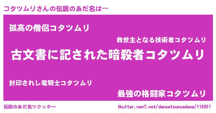 | ヒーロー風カッコイイあだ名 | 『仮面コタダー』『ネオコタツムリ』 |