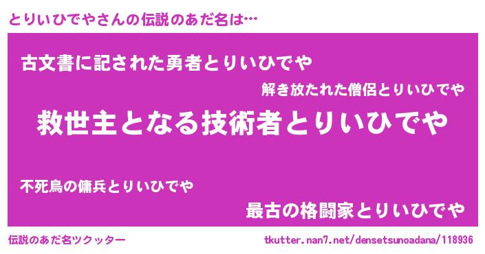 | ヒーロー風カッコイイあだ名 | 『慈愛の使者とりいひでや』 |