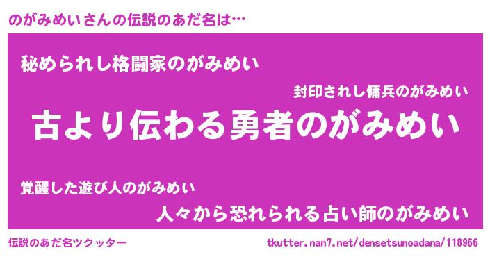 | ヒーロー風カッコイイあだ名 | 『仮面ノガダー』『ネオノガミメイ』 |