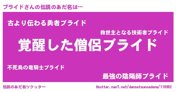 | 男性向けラノベタイトル風あだ名 | 『ブライドの嫁は女の子じゃないと思った?』 |