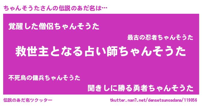 | 男性向けラノベタイトル風あだ名 | 『ちゃんそうた~年齢イコール彼女いない歴の魔法使い~』 |
