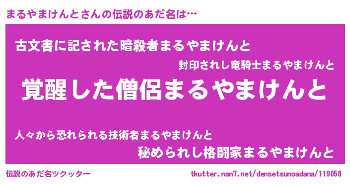 | 男性向けラノベタイトル風あだ名 | 『まるやまけんとの嫁は女の子じゃないと思った?』 |