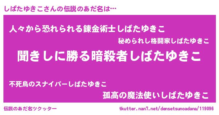 | ヒーロー風カッコイイあだ名 | 『ネオシバタユキコ』『黄金騎士シバ』 |