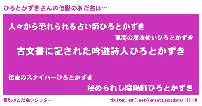 | ヒーロー風カッコイイあだ名 | 『ネオヒロトカズキ』『暗黒騎士ヒロ』 |