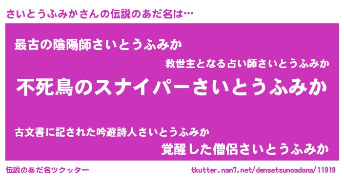 | 肩書あだ名 | 『さいとうふみか御曹司』 |