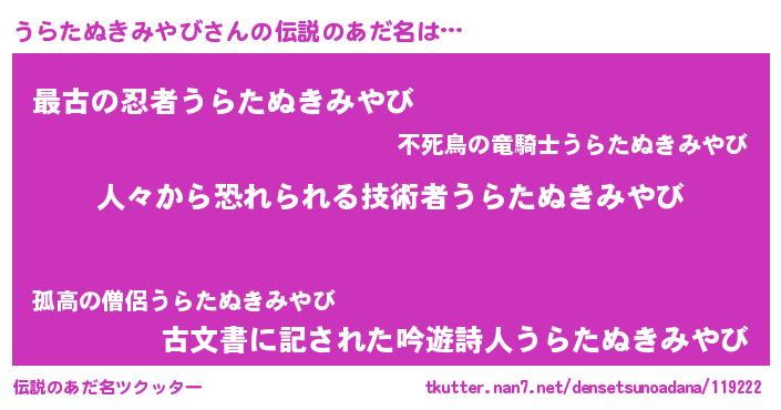| 胡散臭い通販商品みたいなあだ名 | 『100人中100人が認めたマグネット磁石…その名も「うらたぬきみやび」』 |