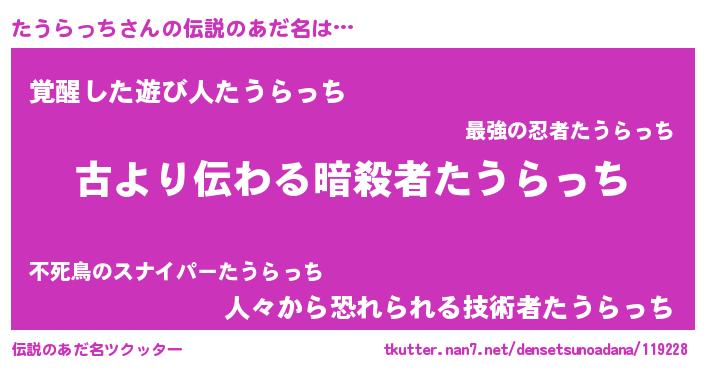 | 男性向けラノベタイトル風あだ名 | 『たうらっちという概念が存在しない退屈な世界 』 |