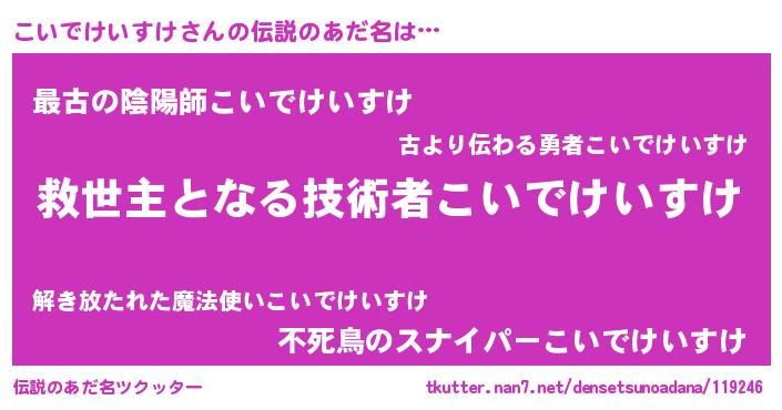 | 男性向けラノベタイトル風あだ名 | 『この素晴らしい世界にこいでけいすけを!』 |