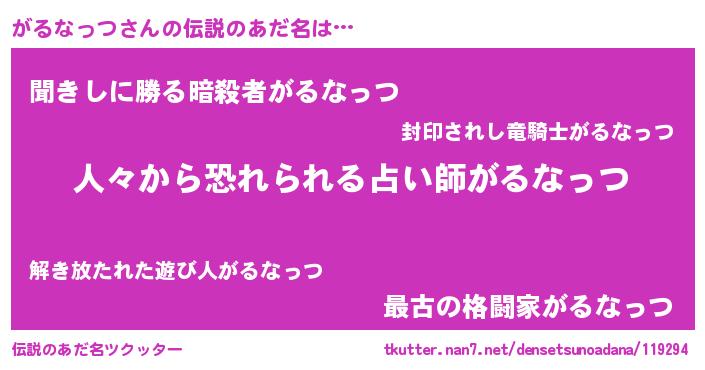 | ヒーロー風カッコイイあだ名 | 『仮面ガルダー』『愛の使者がるなっつ』 |