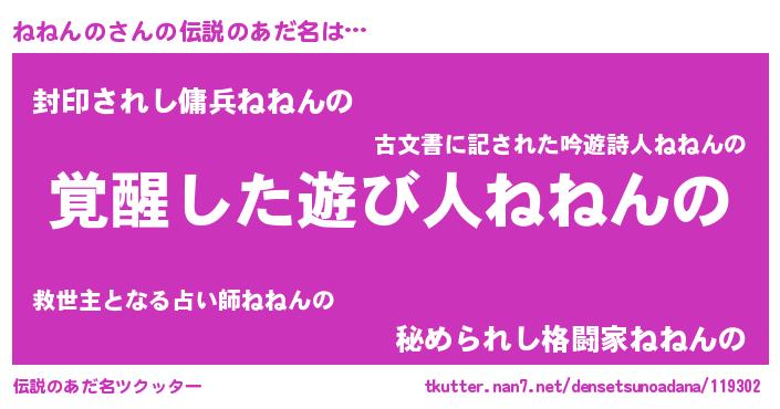 | 男性向けラノベタイトル風あだ名 | 『ねねんのの嫁は女の子じゃないと思った?』 |