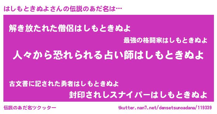 | ヒーロー風カッコイイあだ名 | 『正義の使者はしもときぬよ』 |