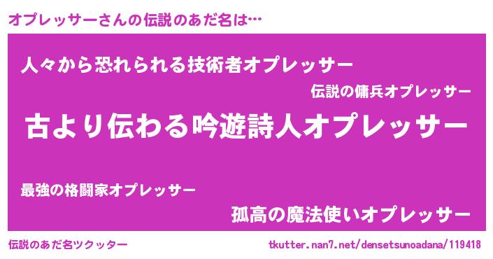 | 男性向けラノベタイトル風あだ名 | 『オプレッサーという概念が存在しない退屈な世界 』 |