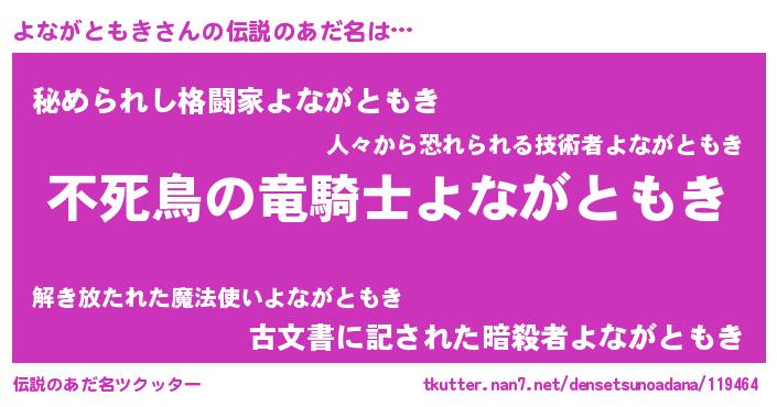 | 男性向けラノベタイトル風あだ名 | 『よながともきの憂鬱』 |