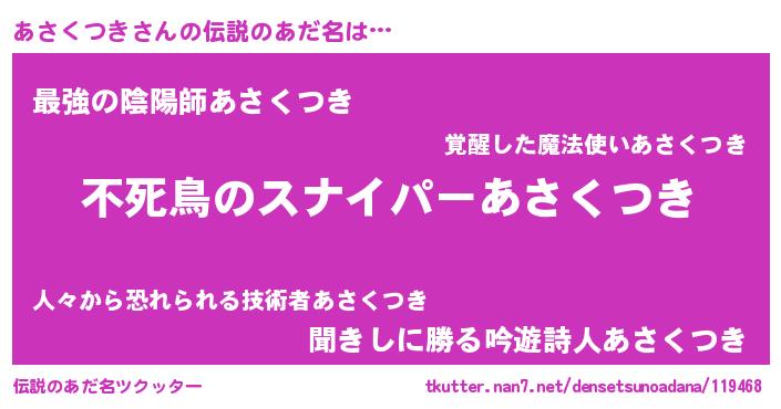 | 女子向けラノベタイトル風あだ名 | 『あさくつき姫と円卓の騎士』 |