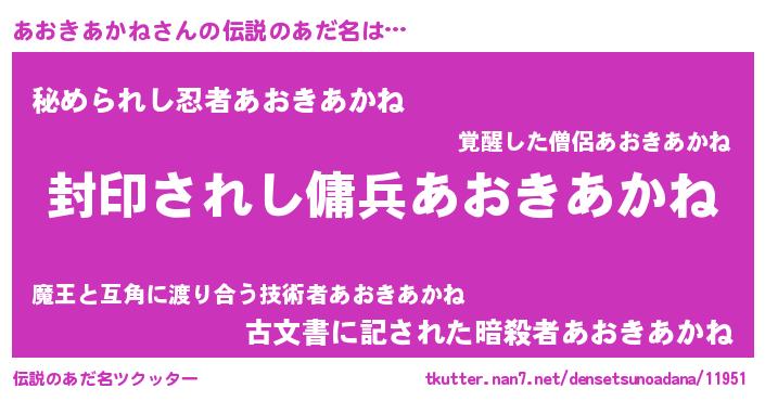 | 男性向けラノベタイトル風あだ名 | 『あおきあかねに滅ぼされるだけの簡単なお仕事です』 |