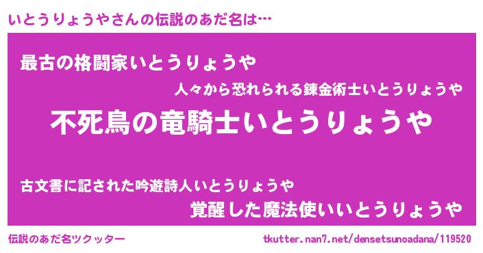 | 女子向けラノベタイトル風あだ名 | 『いとうりょうや姫と円卓の騎士』 |