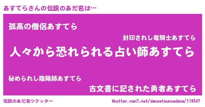 | ヒーロー風カッコイイあだ名 | 『正義の使者あすてら』『黄金騎士アス』 |