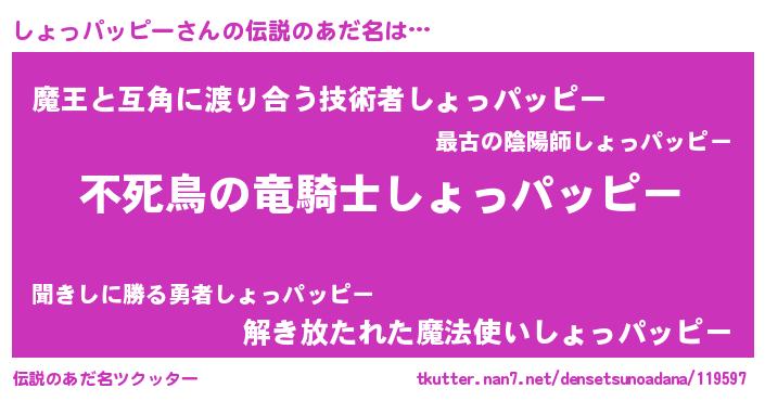 | 男性向けラノベタイトル風あだ名 | 『転生したらしょっパッピーだった件』 |