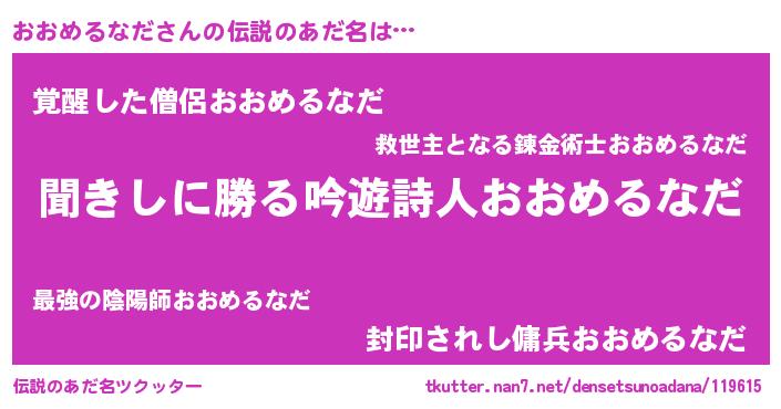 | 意味不明あだ名 | 『住所不定無職おおめるなだ(2歳)』 |