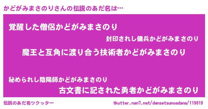 | 女子向けラノベタイトル風あだ名 | 『かどがみまさのり恋絵巻』 |
