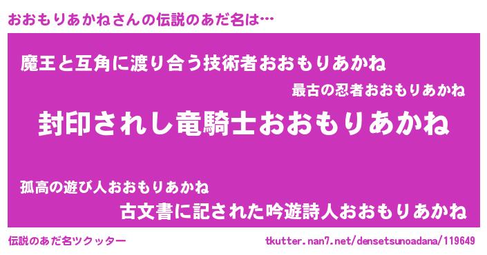 | 男性向けラノベタイトル風あだ名 | 『おおもりあかねに滅ぼされるだけの簡単なお仕事です』 |