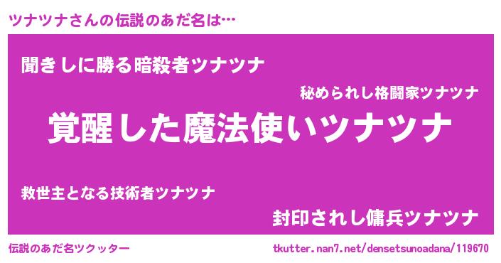 | 男性向けラノベタイトル風あだ名 | 『ツナツナの嫁は女の子じゃないと思った?』 |