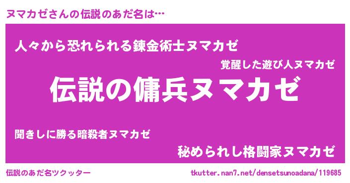 | 男性向けラノベタイトル風あだ名 | 『ヌマカゼスレイヤー』 |