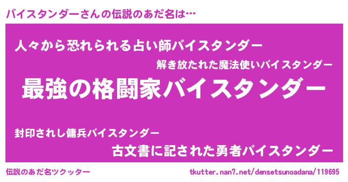 | 男性向けラノベタイトル風あだ名 | 『バイスタンダーに滅ぼされるだけの簡単なお仕事です』 |