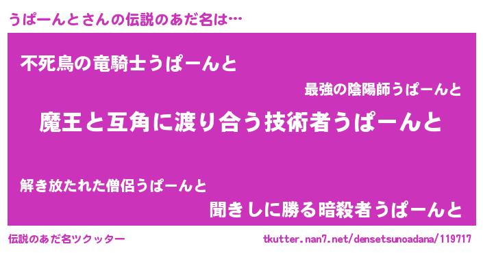 | 意味不明あだ名 | 『住所不定無職うぱーんと(7歳)』 |