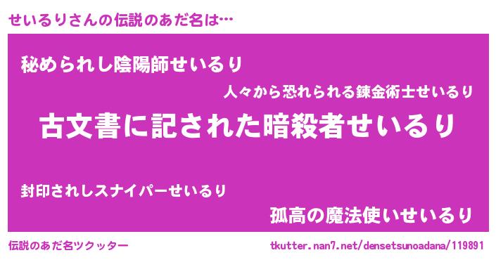 | 意味不明あだ名 | 『ヨモギ科せいるり属』『自称せいるり』 |