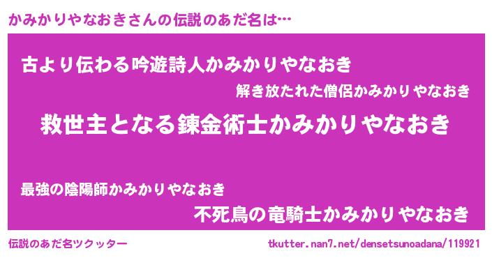 | ヒーロー風カッコイイあだ名 | 『慈愛の使者かみかりやなおき』 |