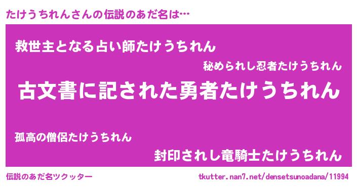 | ヘコむあだ名 | 『たけうちれん(遠い目)』『たけにゅー』 |