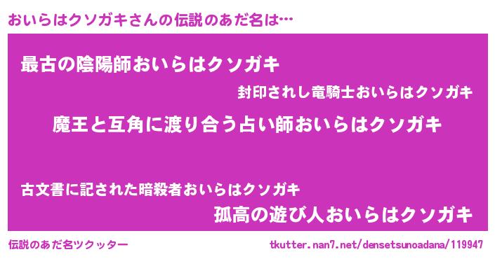 | 男性向けラノベタイトル風あだ名 | 『ノーゲーム・ノーオイラハクソガキ』 |