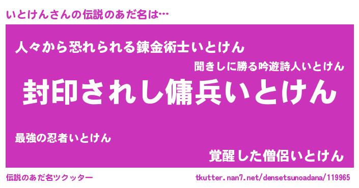 | 男性向けラノベタイトル風あだ名 | 『この素晴らしい世界にいとけんを!』 |