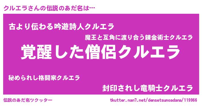 | 女子向けラノベタイトル風あだ名 | 『クルエラストレイドッグス』 |