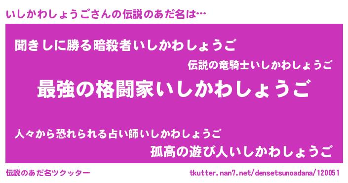 | 肩書あだ名 | 『いしかわしょうご閣下』 |