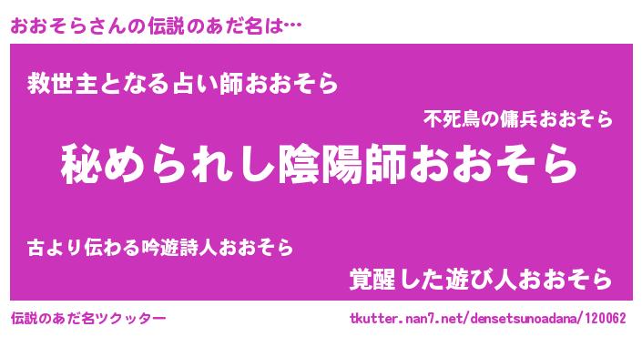 | ヒーロー風カッコイイあだ名 | 『ウルトラおおそらマン』『天弓騎士オオ』 |