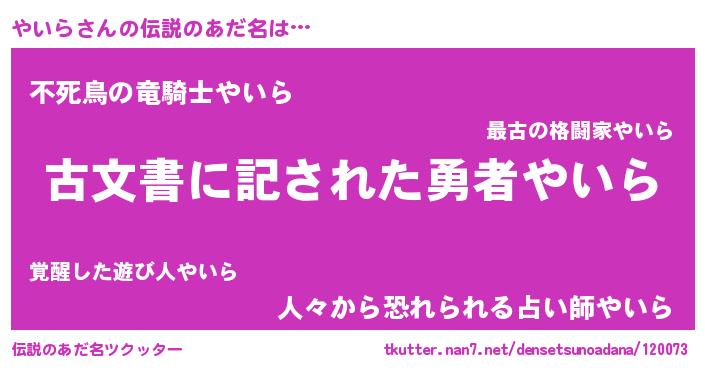 男性向けラノベタイトル風あだ名 | 『やいらに滅ぼされるだけの簡単なお仕事です』 |