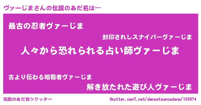 | 男性向けラノベタイトル風あだ名 | 『おまえをオタクにしてやるから、俺をヴァーじまにしてくれ! 』 |