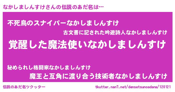 | 男性向けラノベタイトル風あだ名 | 『なかしましんすけに滅ぼされるだけの簡単なお仕事です』 |