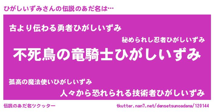 | 男性向けラノベタイトル風あだ名 | 『Re:ひがしいずみから始める異世界生活』 |