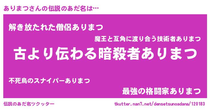 | 胡散臭い通販商品みたいなあだ名 | 『来世でも幸せになれる健康食品…その名も「ありまつ」』 |