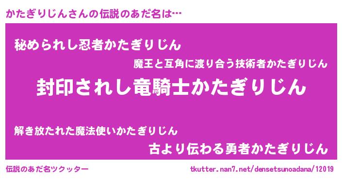 | 男性向けラノベタイトル風あだ名 | 『うちのかたぎりじんが世界を掌握している!』 |