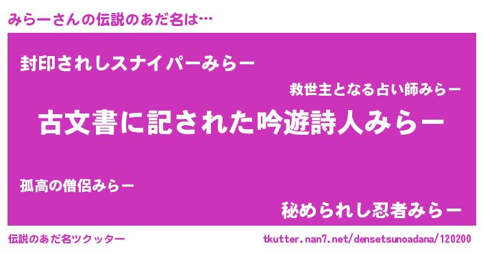 | 男性向けラノベタイトル風あだ名 | 『この素晴らしい世界にみらーを!』 |