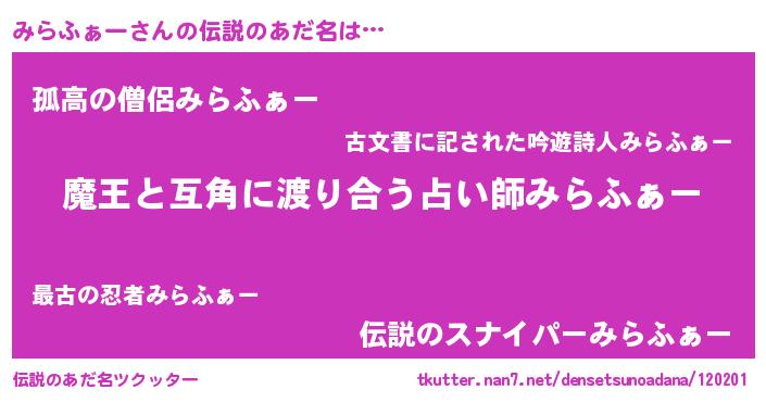 | 女子向けラノベタイトル風あだ名 | 『みらふぁー恋絵巻』 |