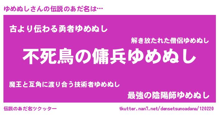 | ヘコむあだ名 | 『ゆめにゅー』『ゆめぬし(震え声)』 |