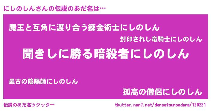 | ヒーロー風カッコイイあだ名 | 『ネオニシノシン』『暗黒騎士ニシ』 |