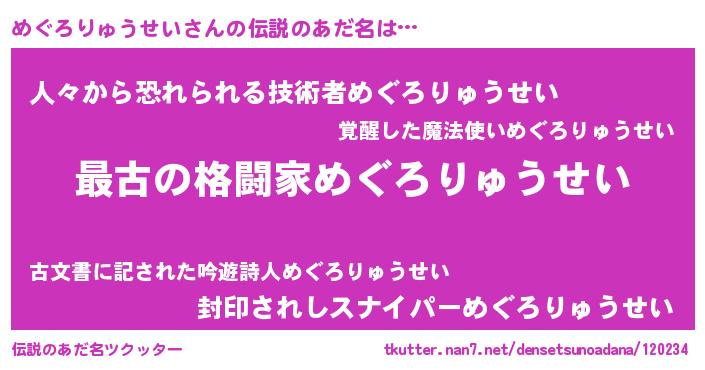 | ヒーロー風カッコイイあだ名 | 『ウルトラめぐろりゅうせいマン』 |