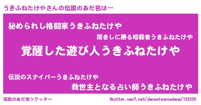 | 意味不明あだ名 | 『住所不定無職うきふねたけや(81歳)』 |