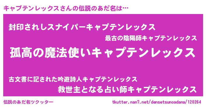 | 胡散臭い通販商品みたいなあだ名 | 『信頼と実績のサプリメント…その名も「キャプテンレックス」』 |